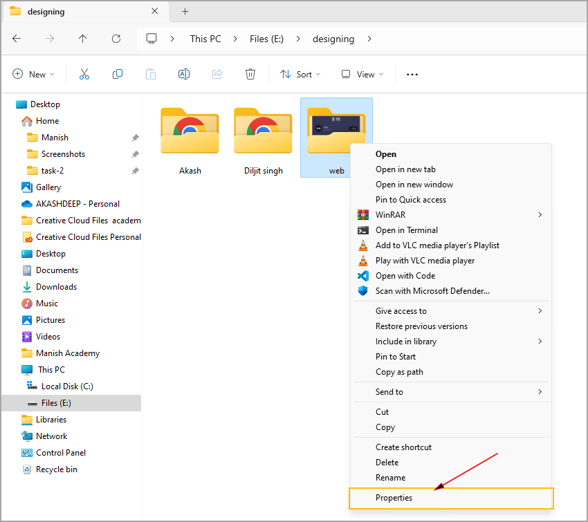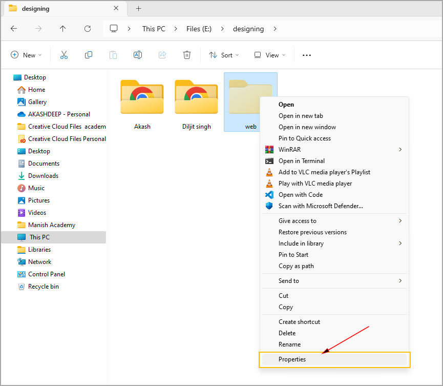 OR you can select the folder and use the shortcut keys Alt+Enter to open properties.