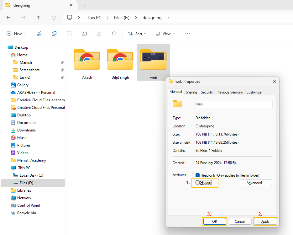 4. Select Hidden(uncheck hidden) and Click Apply and OK.