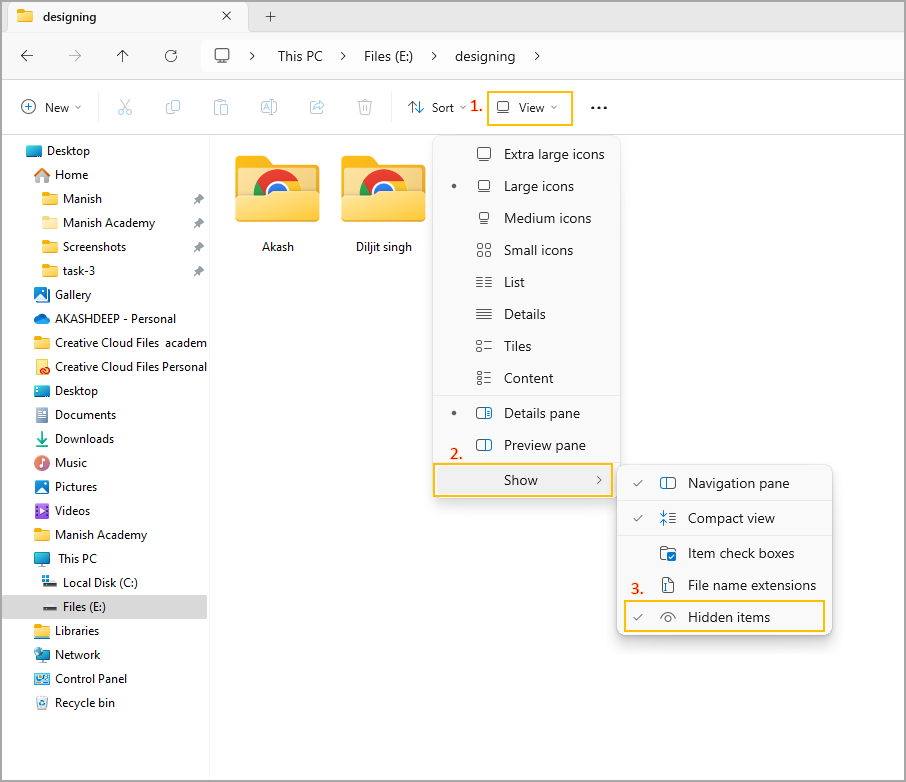 1. First you need to show the Hidden items. For this, Click View>Show>Hidden items.