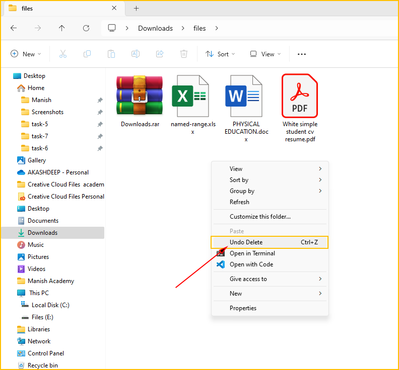 2. Right click in the empty space inside the folder and select the undo delete command.
