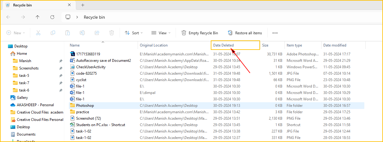 3. Click date deleted so that your files are sorted by deleted date and the files you deleted recently appears at the top.
