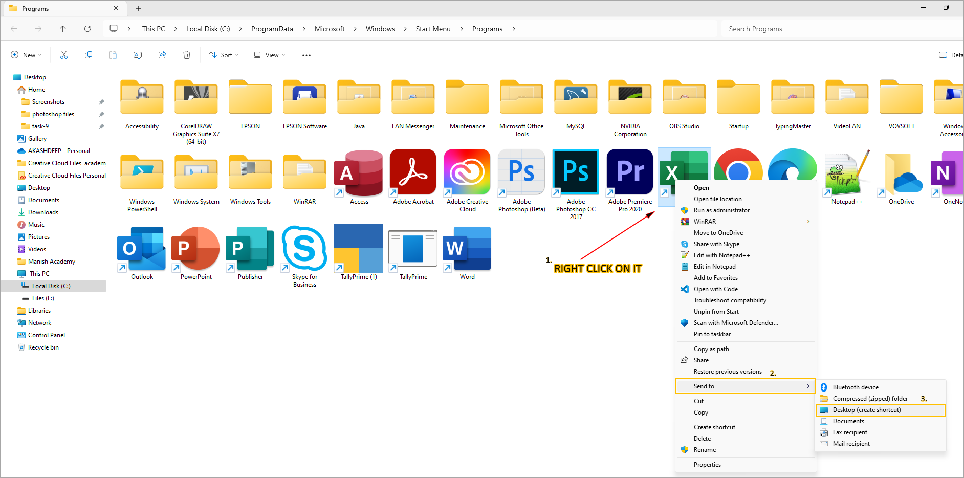 4. Right click onto the Excel application and select Send to > Desktop (create shortcut).
