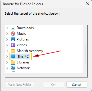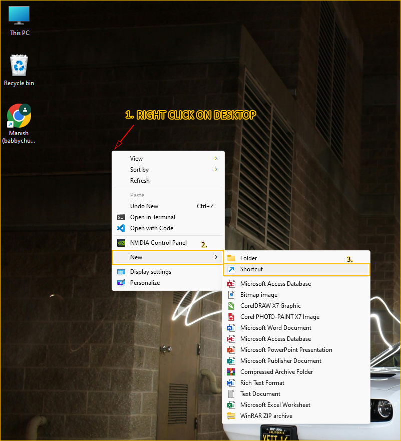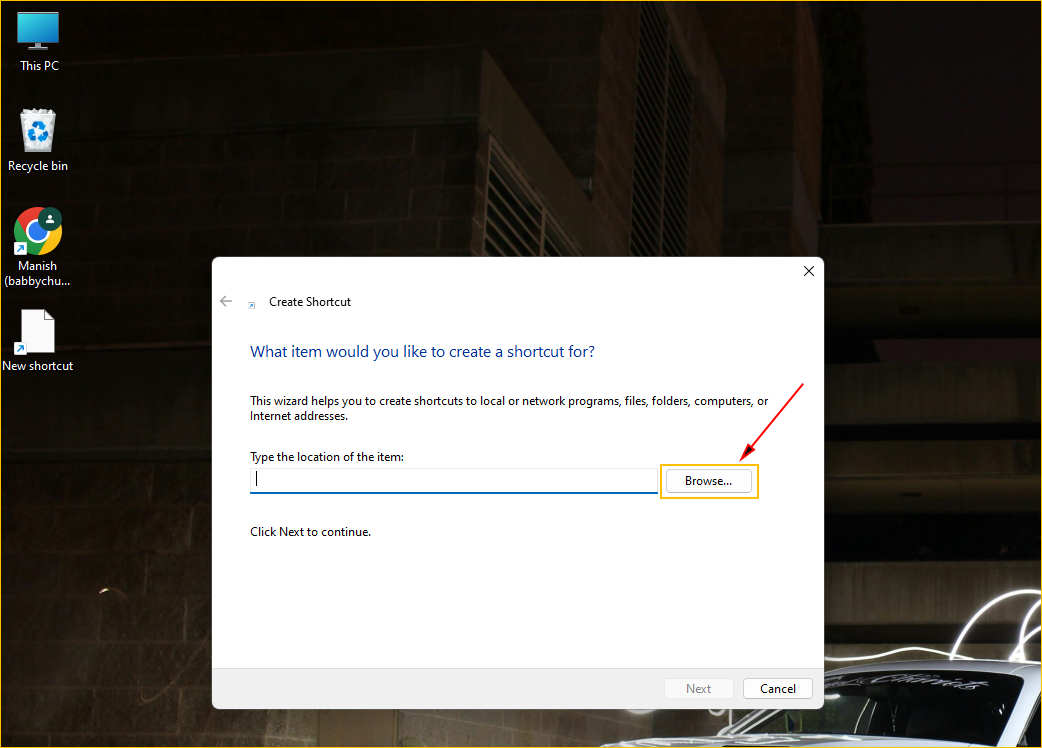 1. Right click anywhere on the desktop and select New>Shortcut.