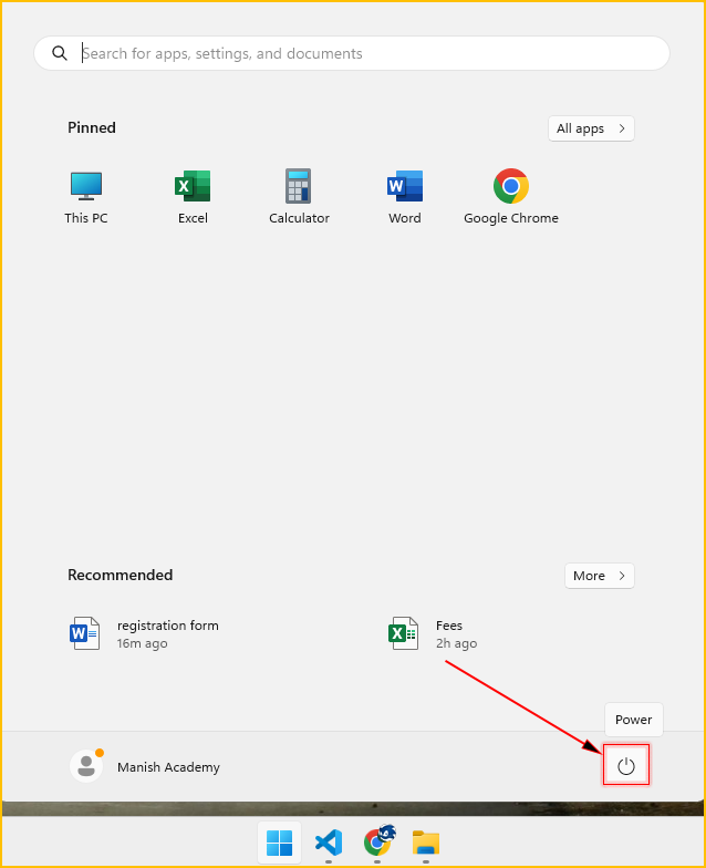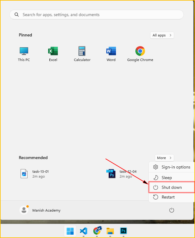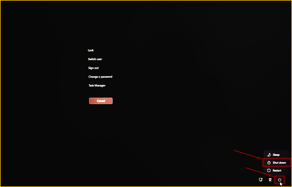 2. Click the Power icon in the bottom-right corner of the screen and select Shut down.
