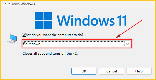 2. In the "Shut Down Windows" dialog box, select "Shut down" from the drop-down menu..
