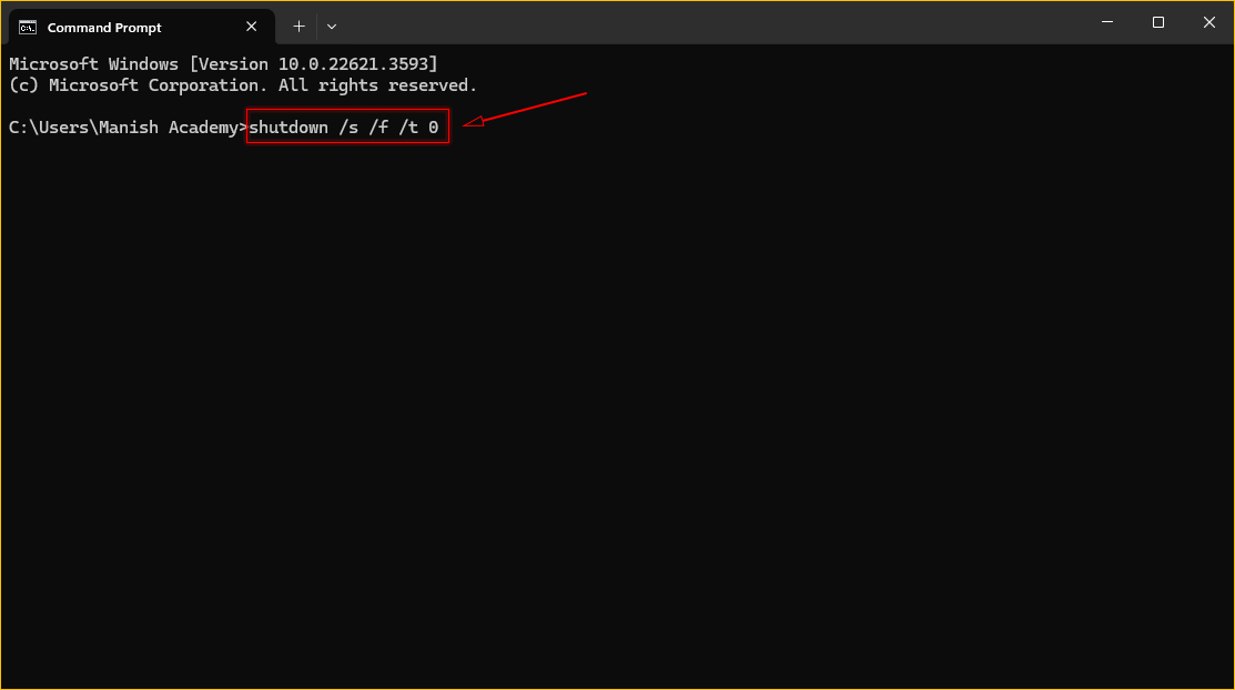 3. Type shutdown /s /f /t 0 and press Enter.