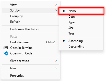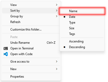 2. Right-click on an empty space in the folder and select Sort by.