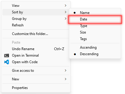 From the sort by options, select - Date . This option sorts files by the date and time they were last modified