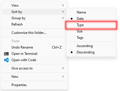 From the sort by options, select - type . This option sorts files by their file type (extension).