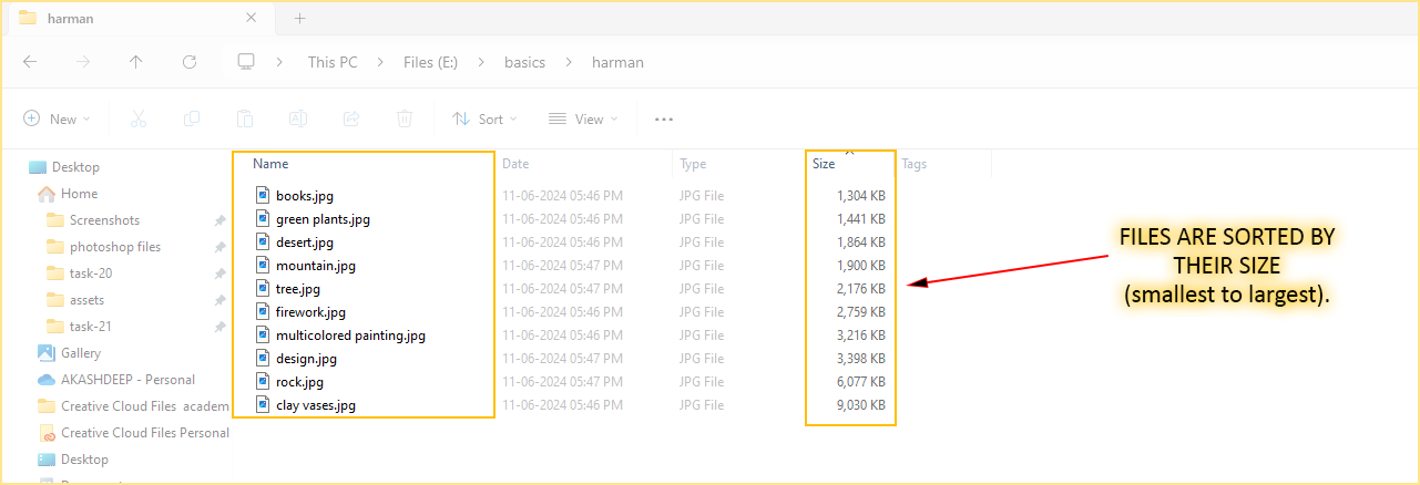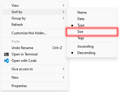 Now, the files will be sorted by their size in ascending order(smallest to largest).