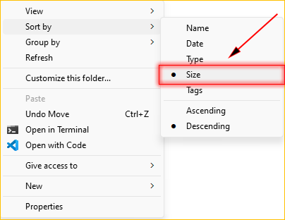 From the sort by options, select - size . This option sorts files by their size, from smallest to largest or vice versa.