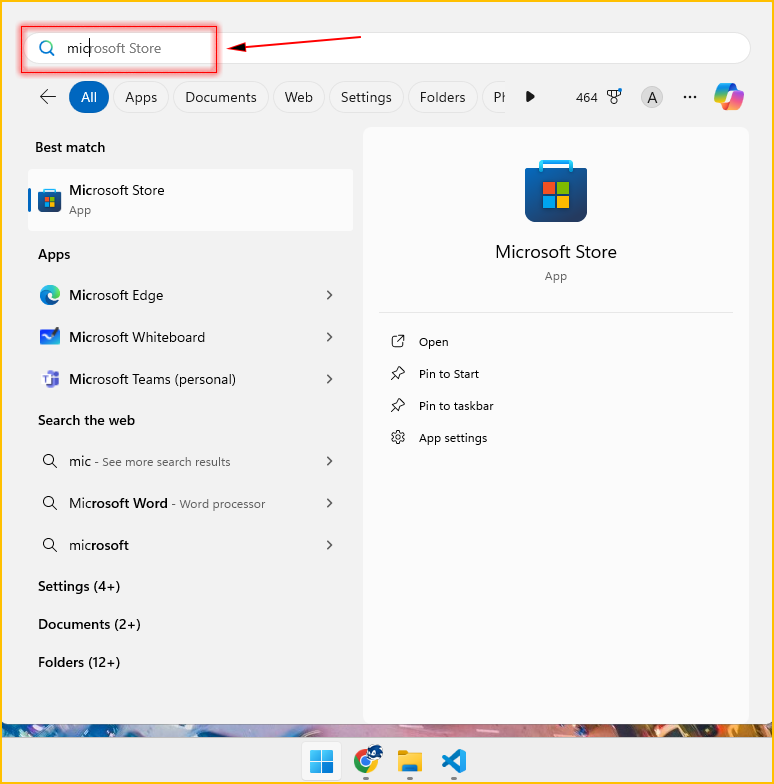 Note: you don't need to type microsoft store fully in the search bar, just type first few initials like micro and hit enter.