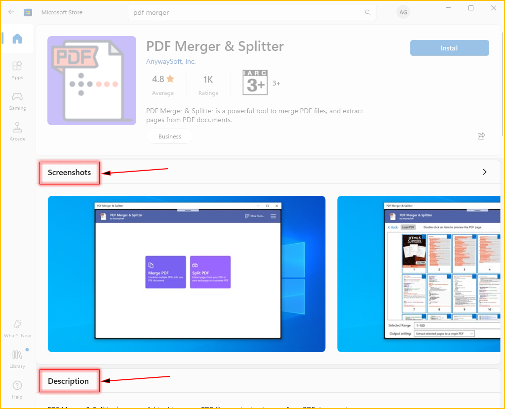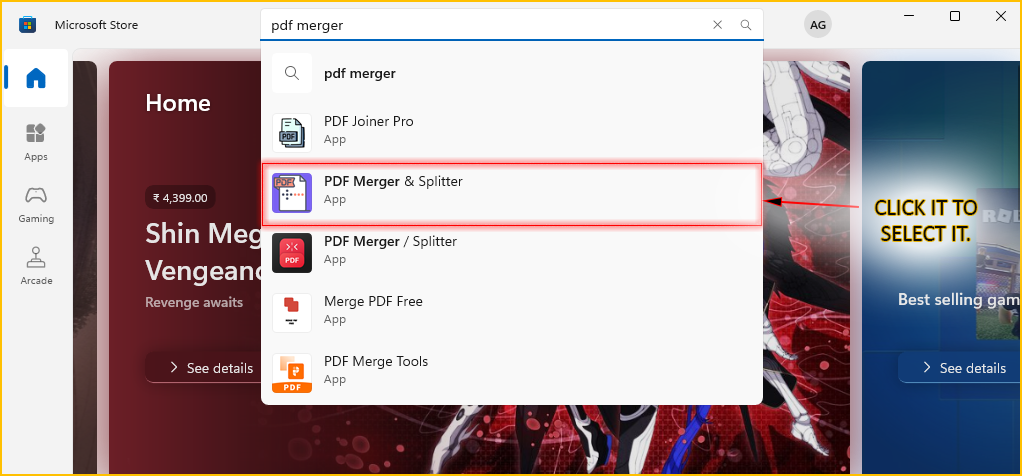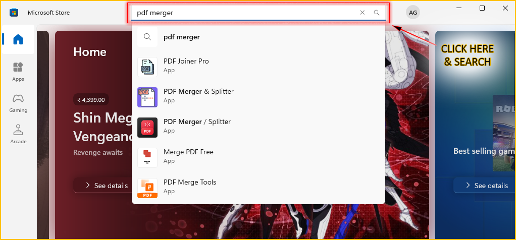 1. Click in the search bar of the Microsoft Store and type pdf merger and splitter.