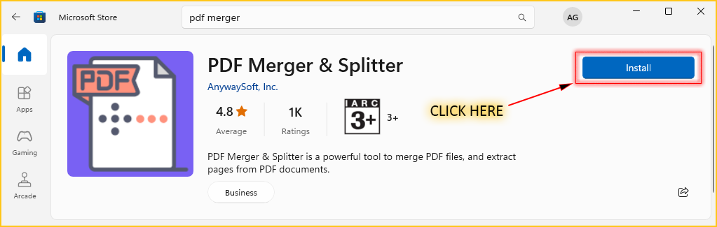 2. From the search results, find the "PDF Merger & Splitter" app and click on it. This will open the app's page with more details.